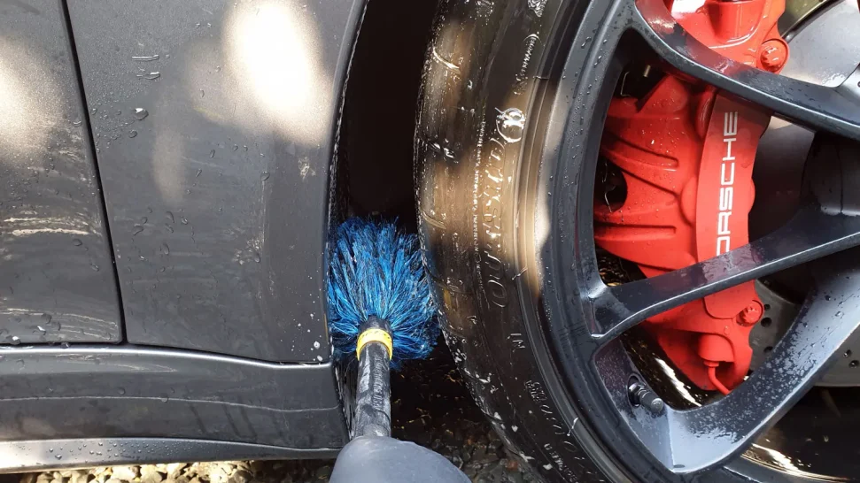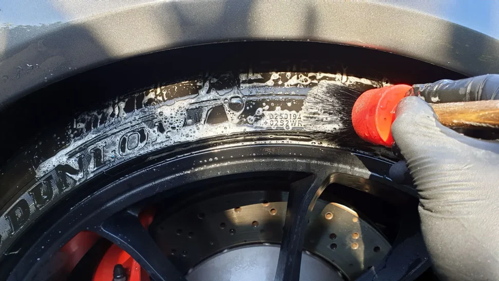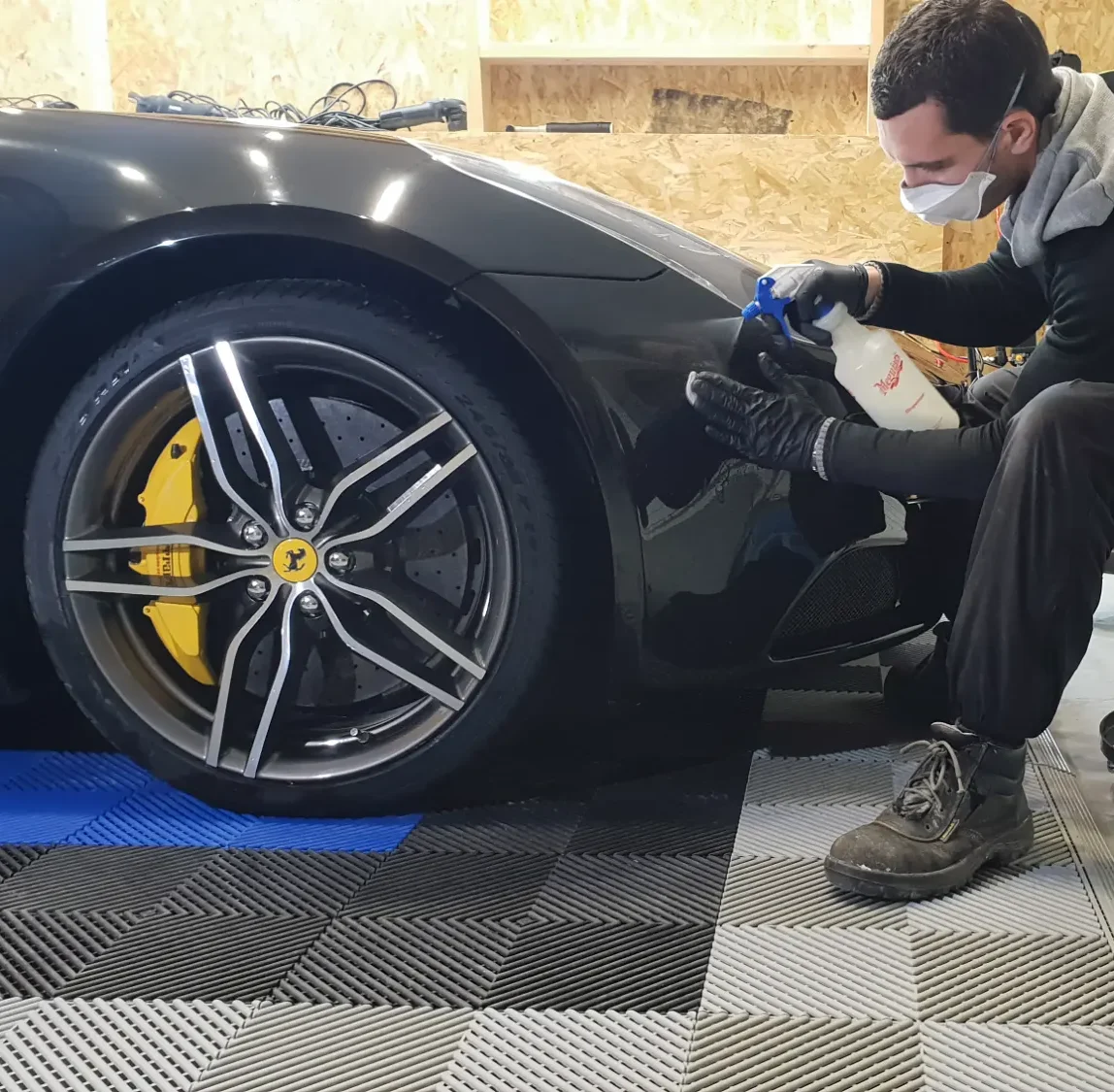 Pour un lavage extérieur soigné, chaque étape est réalisée avec une attention minutieuse pour garantir un résultat impeccable. One Detailer commence par le nettoyage des passages de roues, suivi d’un traitement approfondi des jantes à l’aide de brosses spécifiques permettant de nettoyer efficacement les faces intérieure et extérieure. Le nettoyage et le dégraissage des flancs des pneus sont également réalisés pour préparer ces derniers à un traitement de finition qui les maintiendra souples et préviendra le craquèlement. Le prélavage à la mousse active est une étape incontournable : il élimine les contaminants et le film routier, facilitant ainsi le lavage manuel. Celui-ci est ensuite effectué avec un gant en microfibre haut de gamme, conçu pour minimiser la création de micro-rayures et préserver l’intégrité de la peinture. Selon l’état de la carrosserie, une décontamination chimique (dégoudronnage et désoxydation des particules ferreuses) et mécanique peut s’avérer nécessaire. Cette étape élimine les résidus tenaces et garantit une surface parfaitement lisse et non rugueuse, essentielle avant l’application d’une cire. J'utilises des cires liquides, synthétiques ou naturelles (Carnauba), adaptées à la peinture et au traitement initial de votre véhicule, pour offrir une brillance et une protection optimales. Enfin, une passe de lustrage pour rehausser la brillance ainsi qu'un traitement de finition est appliqué pour sublimer et préserver chaque surface, notamment les canules d'échappements, les joints, les plastiques extérieurs et les flancs des pneus. Grâce à ces étapes, votre véhicule bénéficie d’un entretien complet qui allie esthétisme et protection durable.