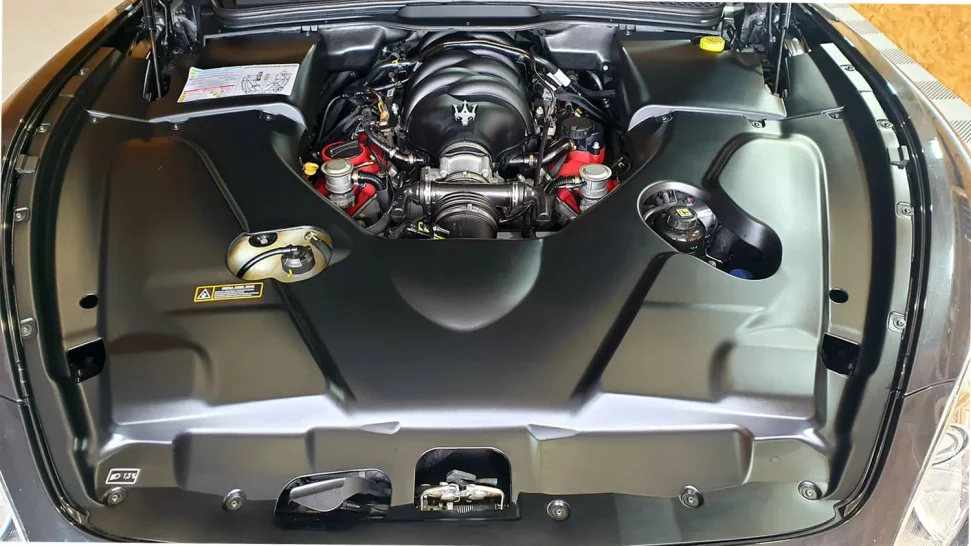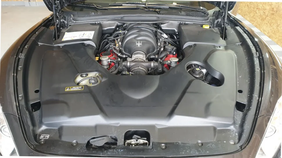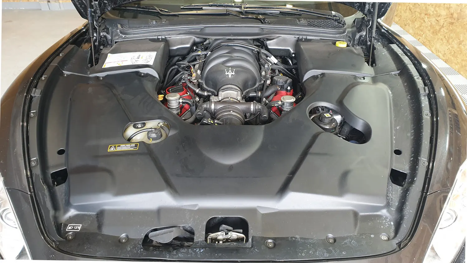 Le nettoyage du compartiment moteur se fait manuellement à l'aide d'un nettoyeur vapeur et d'un dégraissant afin de préparer toutes les surfaces avant l'application d'un traitement de finition. Le nettoyage du moteur est délicat et nécessite avant tout d'intervenir sur les contours du compartiment moteur ainsi que sur les durites et plastiques moteur. L'application d'un traitement de finition à pour but de prévenir le durcissement et le craquèlement des durites et plastiques moteur redonnant un aspect noir.